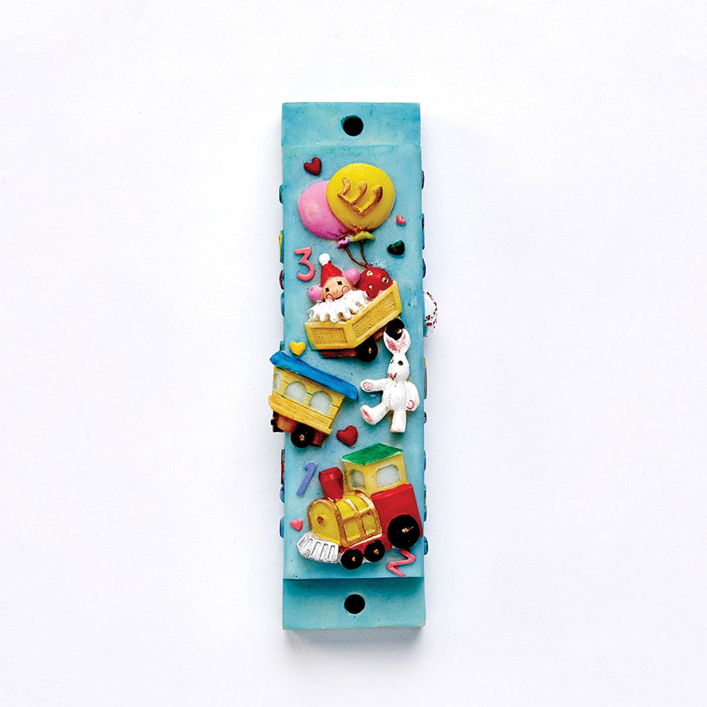 Brighten up your space with this charming mezuzah, adorned with a delightful train and colorful balloons. Crafted from durable poly-resin and hand-painted for a unique touch, it’s perfect for adding a playful element to your home. Designed to hold a scroll of up to 7.5cm/3 inches, this mezuzah is both functional and a wonderful decorative piece.