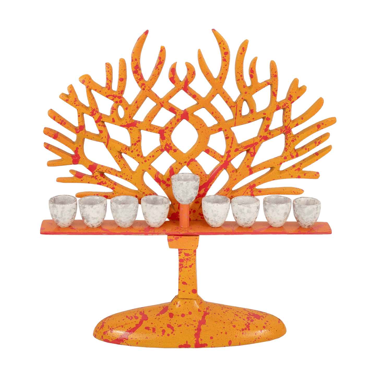 This gorgeous Hanukkiah gives a fantastic modern twist to the classic menorah! The traditional Hanukkiah shape has been turned into an aluminum painted Tree of Life with grey candle holders.