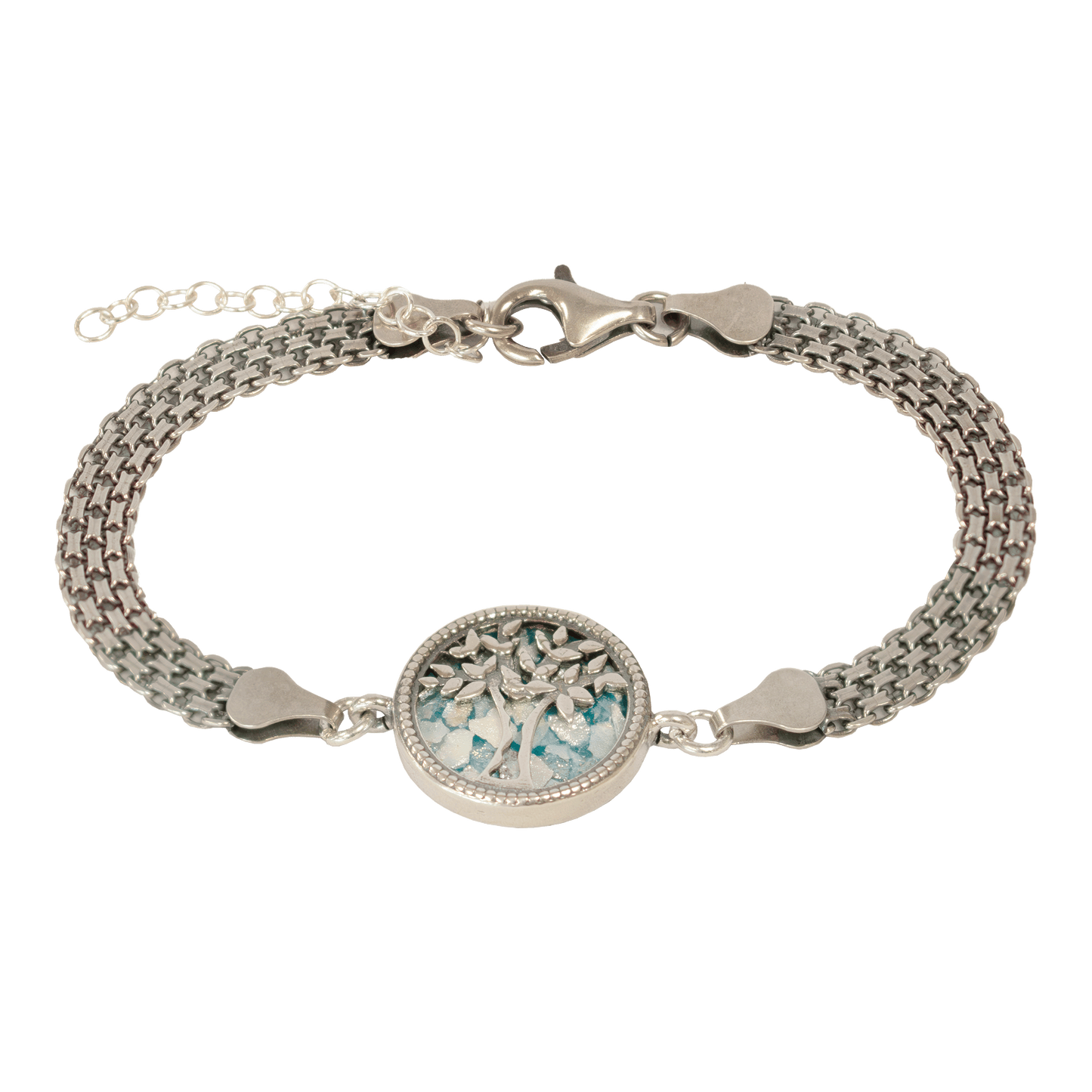 This amazing bracelet features a piece of ancient Roman glass encapsulated in a round 925 sterling silver frame. The iridescent glass forms the base on which a beautifully intricate Tree of Life has been created in. Roman glass, with its uniquely holographic blue-green patina, dates back over 2000 years and is considered an integral part of Israel’s history.