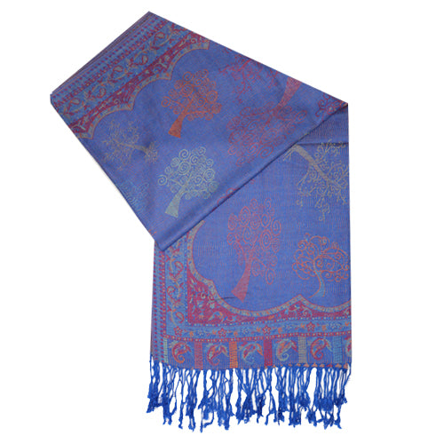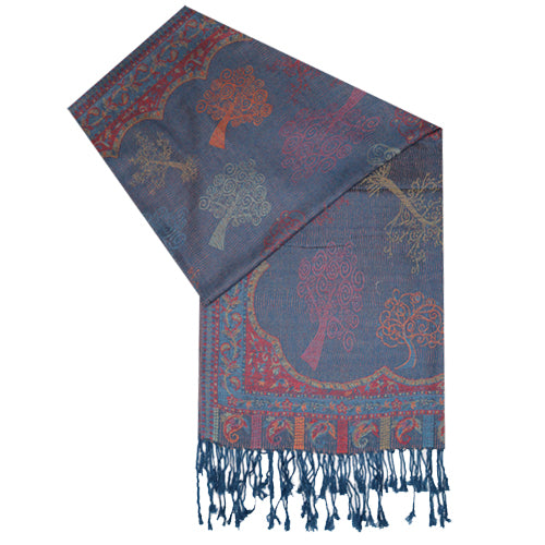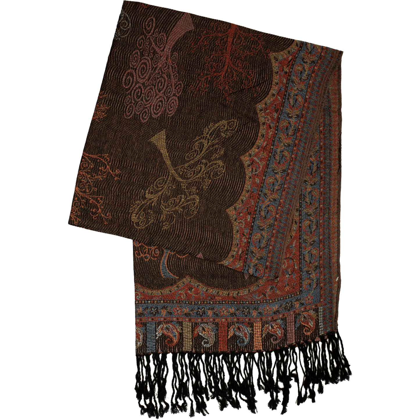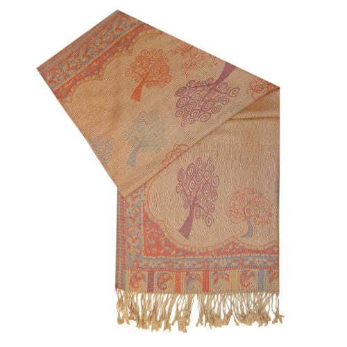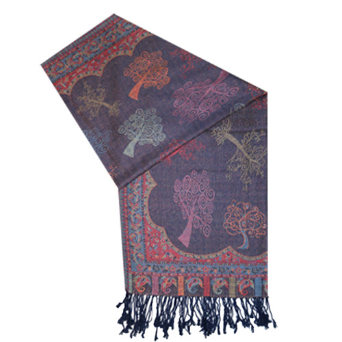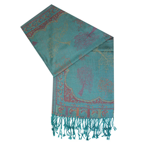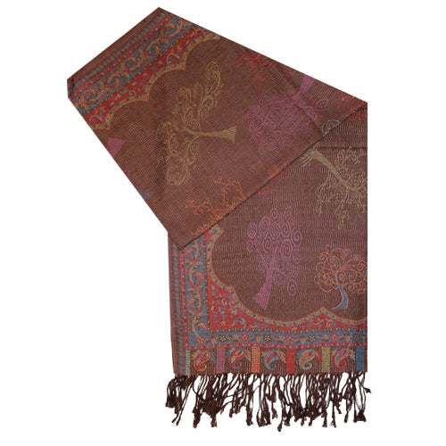 This charming lightweight scarf showcases multiple Trees of Life throughout its width and length, bordered by elegant vines along the long edges and paisley prints along the short edges. Featuring a vibrant color palette this distinctive scarf is a true statement piece. Adding to its allure, the ends of the scarf are embellished with a 3-inch long fringe, meticulously knotted to prevent fraying. Crafted from a beautifully woven 50/50 blend of Rayon & Acrylic, this scarf offers the luxurious feel of soft cashmere.