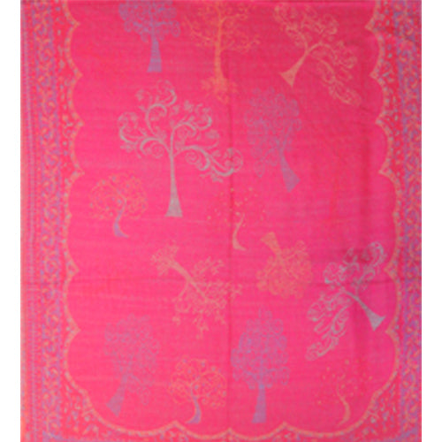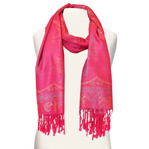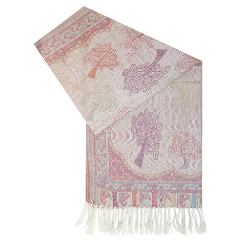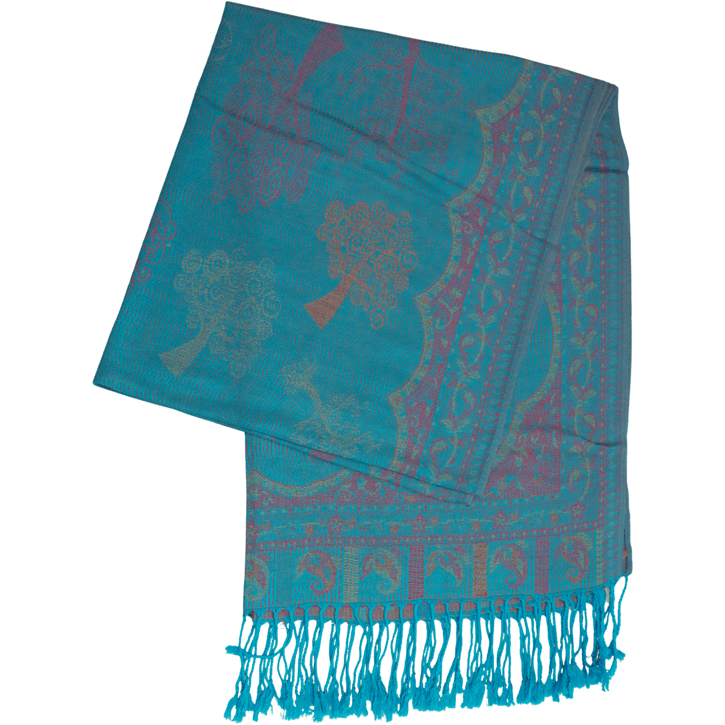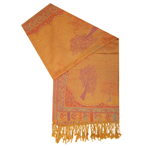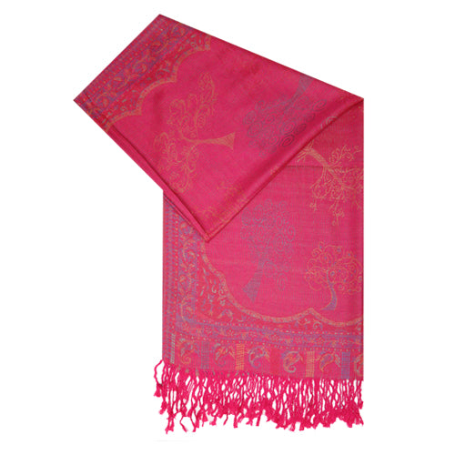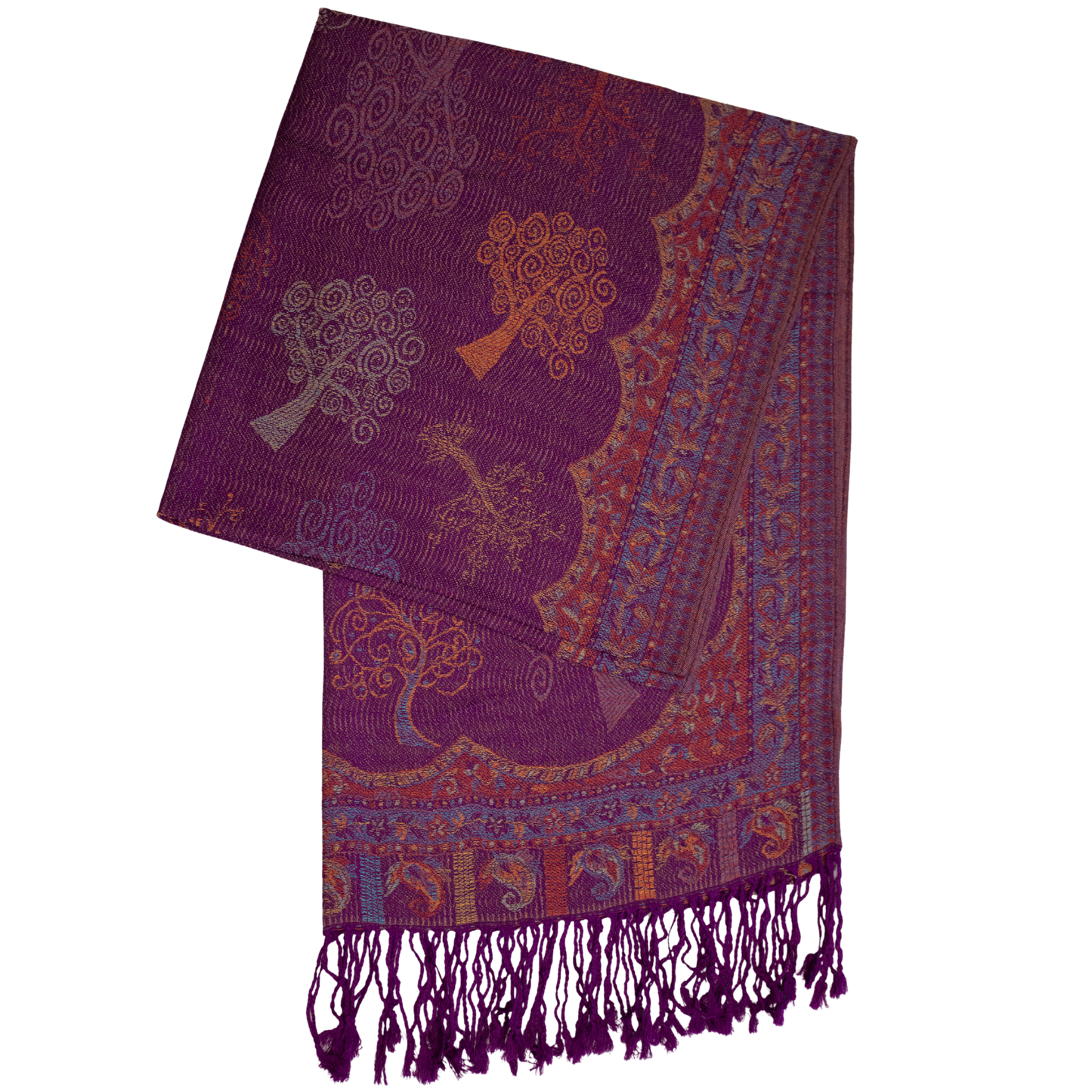 This charming lightweight scarf showcases multiple Trees of Life throughout its width and length, bordered by elegant vines along the long edges and paisley prints along the short edges. Featuring a vibrant color palette this distinctive scarf is a true statement piece. Adding to its allure, the ends of the scarf are embellished with a 3-inch long fringe, meticulously knotted to prevent fraying. Crafted from a beautifully woven 50/50 blend of Rayon & Acrylic, this scarf offers the luxurious feel of soft cashmere.
