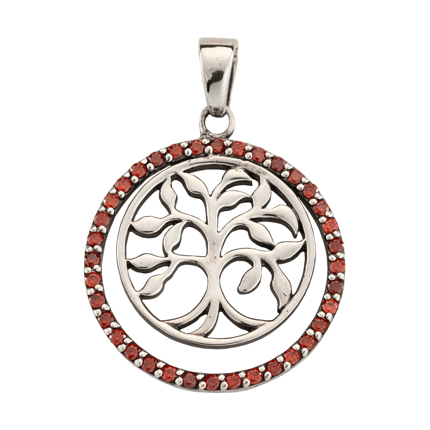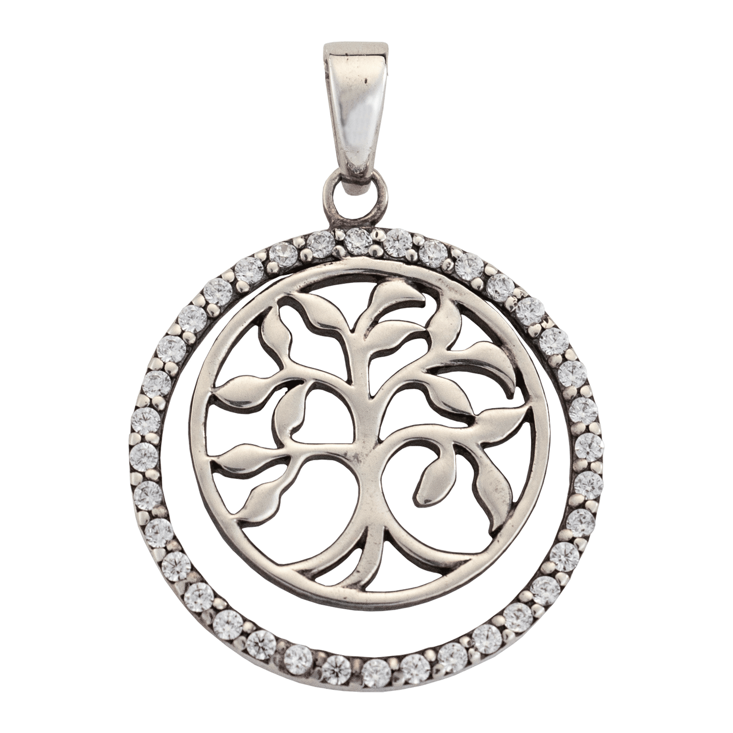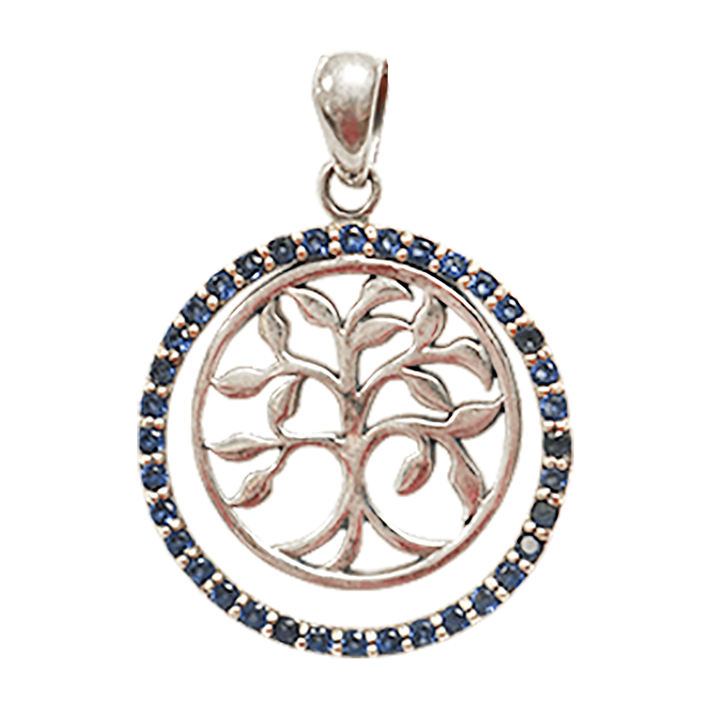 This dazzling pendant has been masterfully crafted out of .925 sterling silver with a design that includes the tree of life as the centerpiece of the circular pendant. The pendant is studded with an array of stones that surround the tree of Life focal point.
