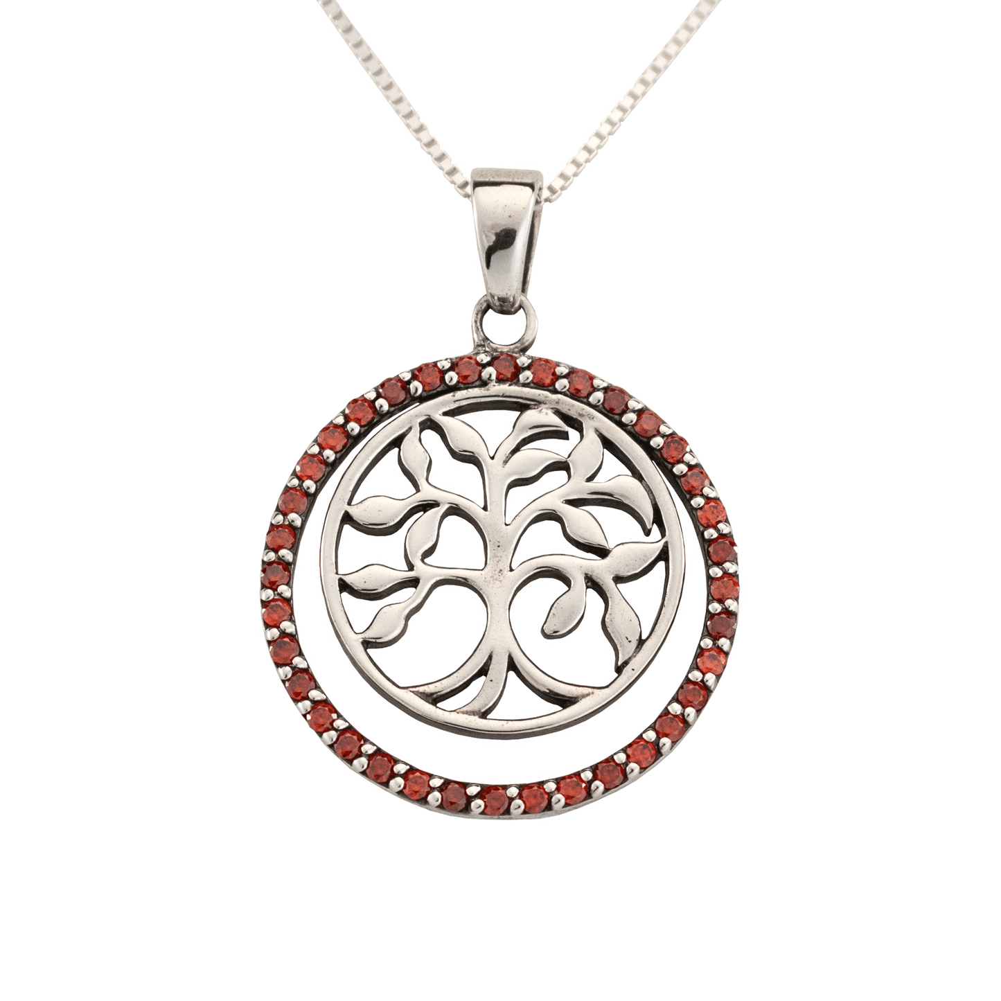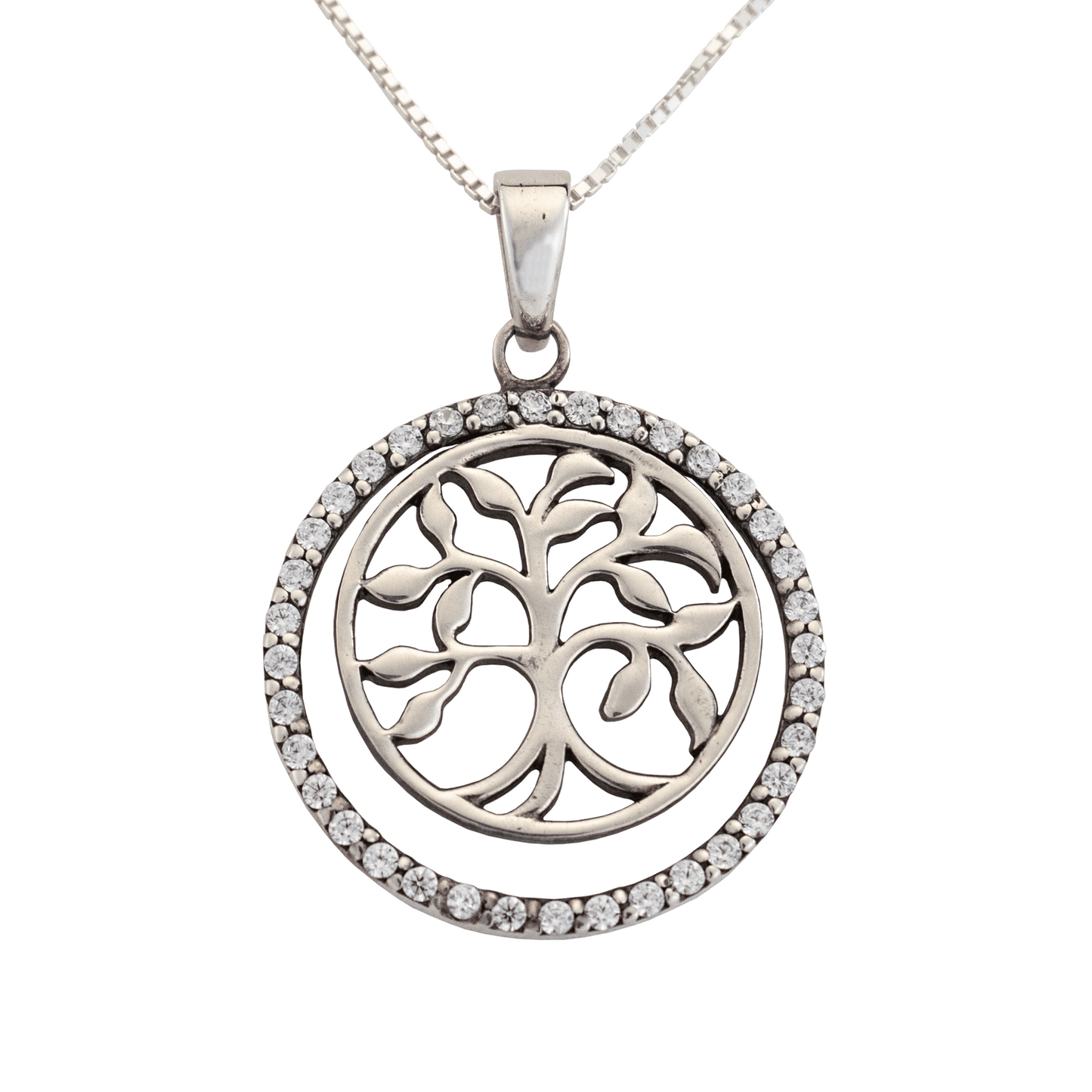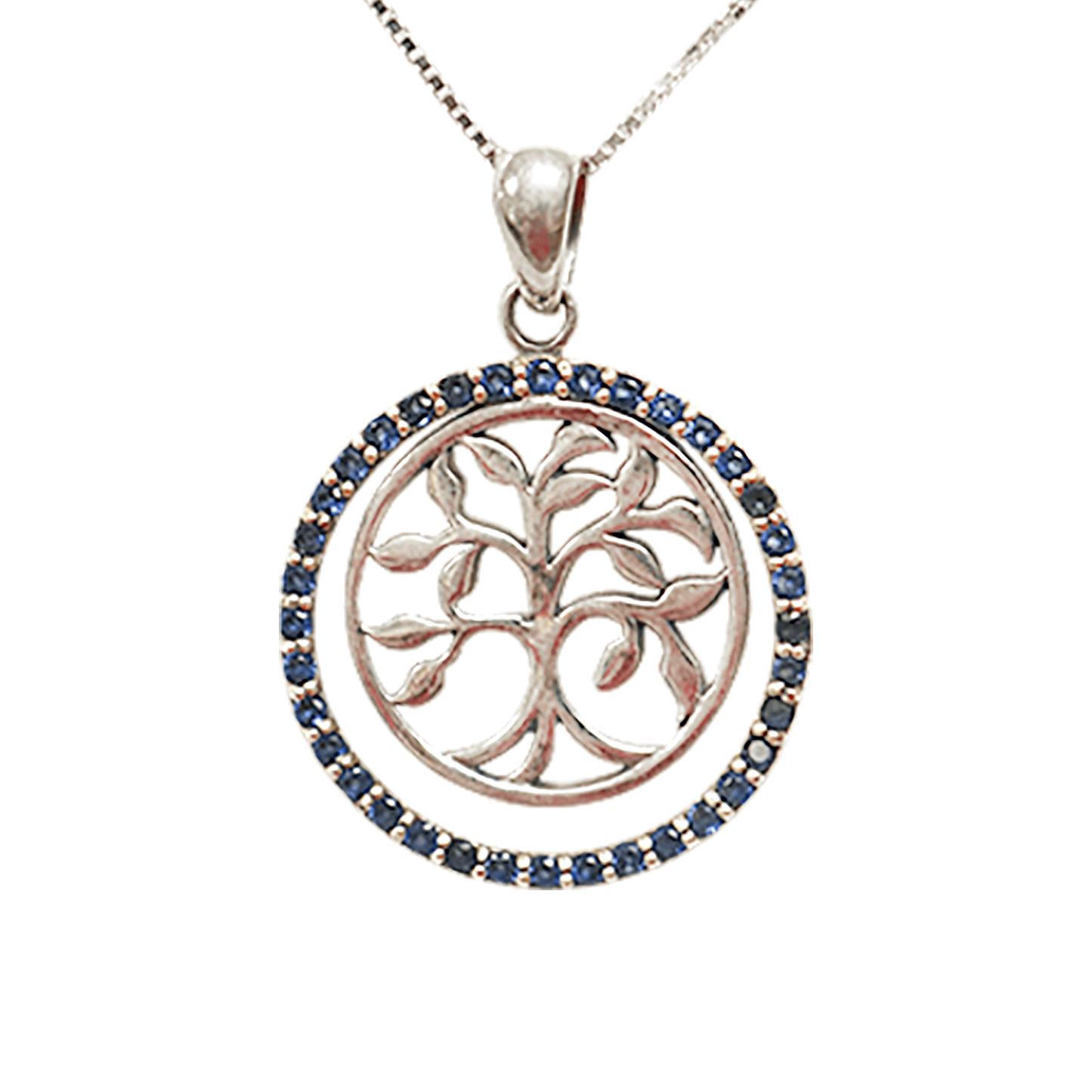 This dazzling pendant has been masterfully crafted out of .925 sterling silver with a design that includes the tree of life as the centerpiece of the circular pendant. The pendant is studded with an array of stones that surround the tree of Life focal point.