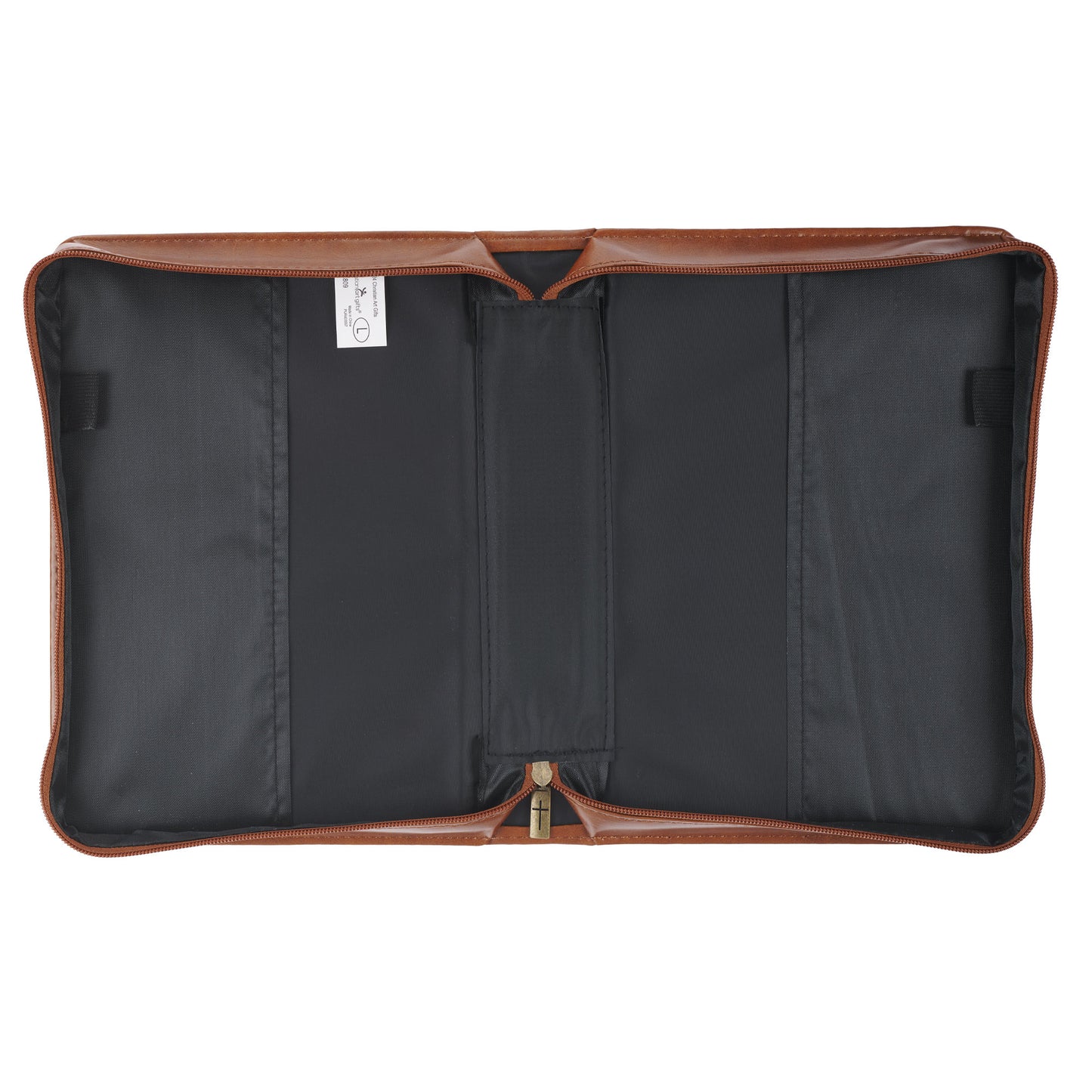 A lay-flat handle constructed of antique gold metal hardware and faux leather ensures the Bible case opens completely flat. An antique gold metal zipper pull with an engraved cross design beautifully complements the case's overall design. The heat-debossed frame is repeated on a slip pocket on the back panel.