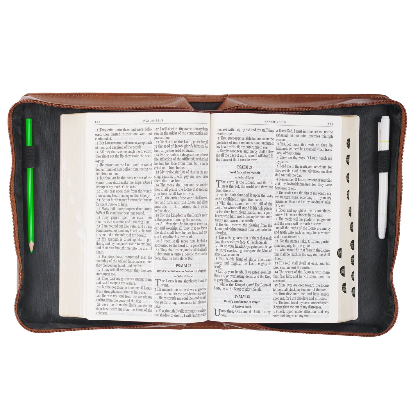 The Trust in the Lord Honey-brown Faux Leather Classic Bible Cover is available in three sizes: medium, large, and extra-large. Please refer to the last image in the image carousel on the left for the Bible Cover Sizing Chart before you make a selection.