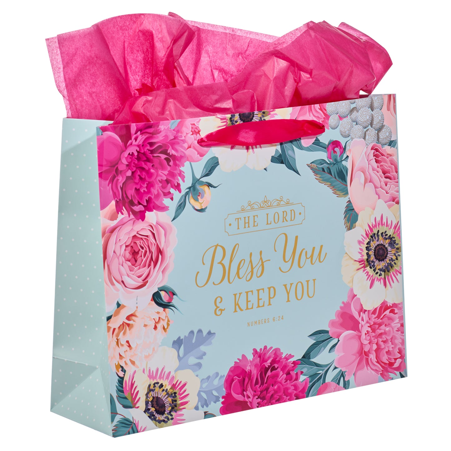 Bless You & Keep You Pink Floral Large Landscape Gift Bag with Card - Numbers 6:24