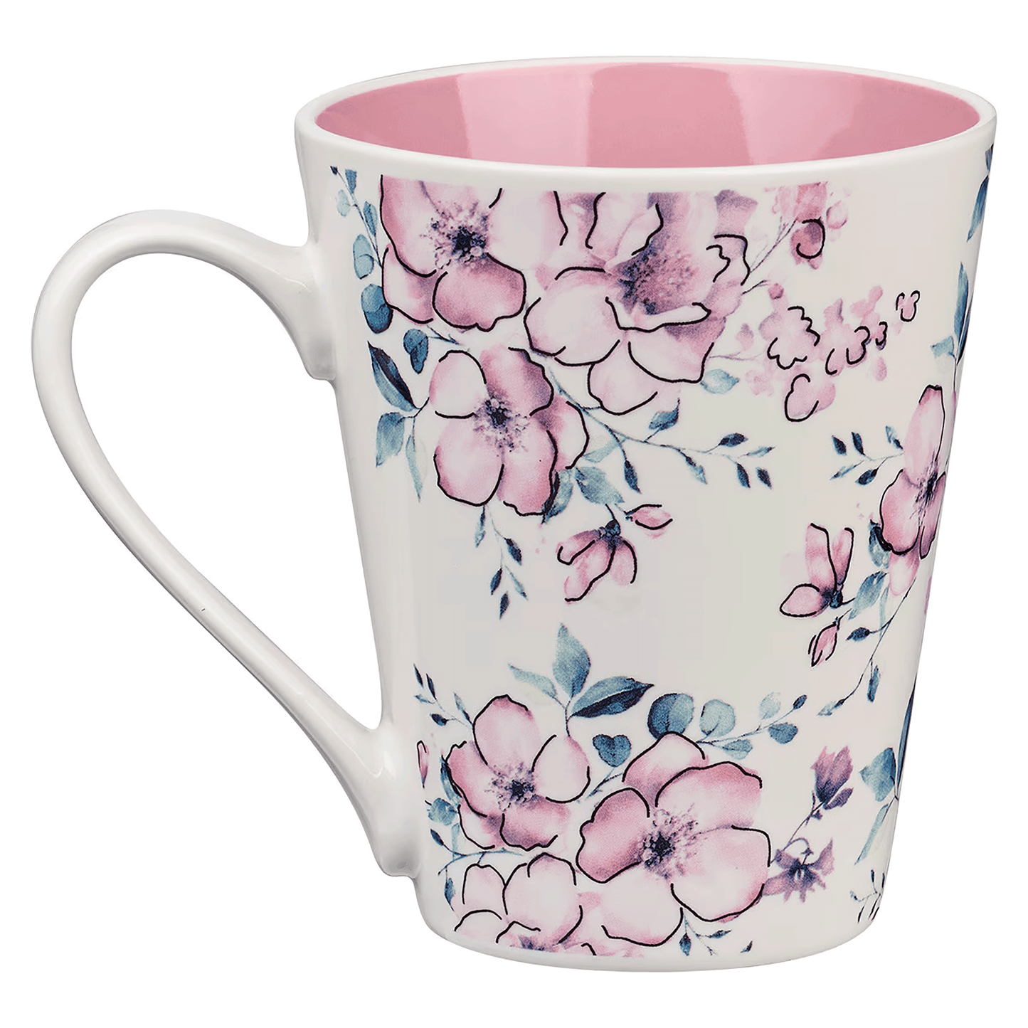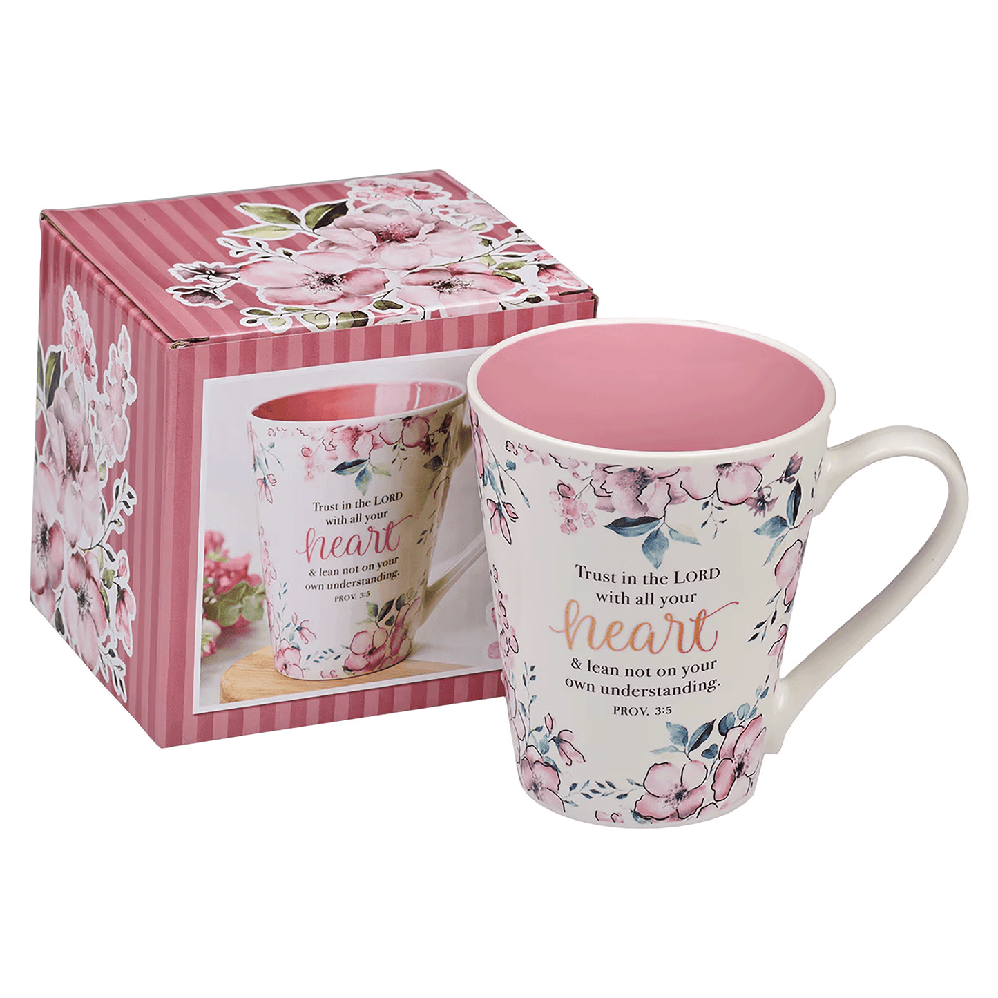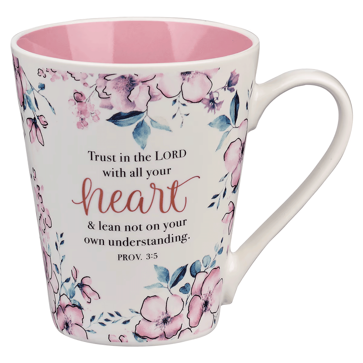 The Trust in the LORD Pink Floral Ceramic Coffee Mug is a beautiful tribute to a woman of strong faith. This cone-shaped mug features a vibrant pink blossom design, accented by blue-green leaves for a balanced look. The verse, “Trust in the Lord with all your heart and lean not on your own understanding” (Proverbs 3:5), is printed in black with gold foil accents, adding a touch of elegance.