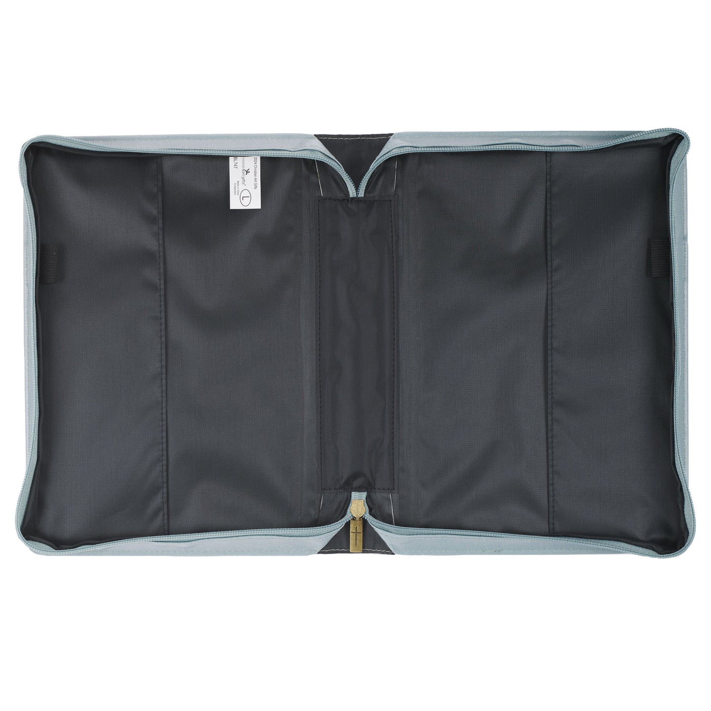Store your loose notes or church bulletins in the slip pocket on the back panel. The fold-away handle, made from pearlized ivory faux leather, is attached to the spine with antique brass metal hardware. The zipper pull, crafted from the same antique brass metal, is tastefully engraved with a cross.