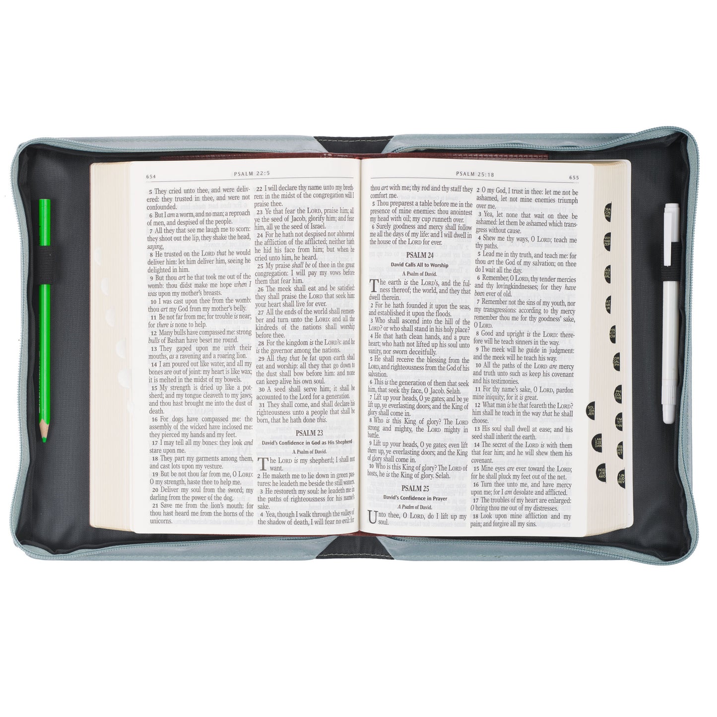 This Bible cover is available in two sizes: medium and large. Please refer to the last image in the image carousel on the left for the Bible Cover Sizing Chart before you make a selection.