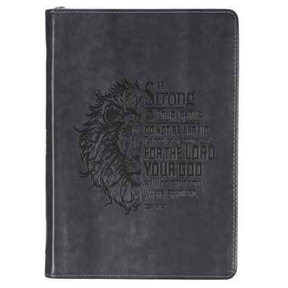 The captivating cover of the Be Strong and Courageous Classic Gray Faux Leather Journal with Zipper Closure showcases a dynamic fusion of a lion's imposing face and a message of bravery and resilience.