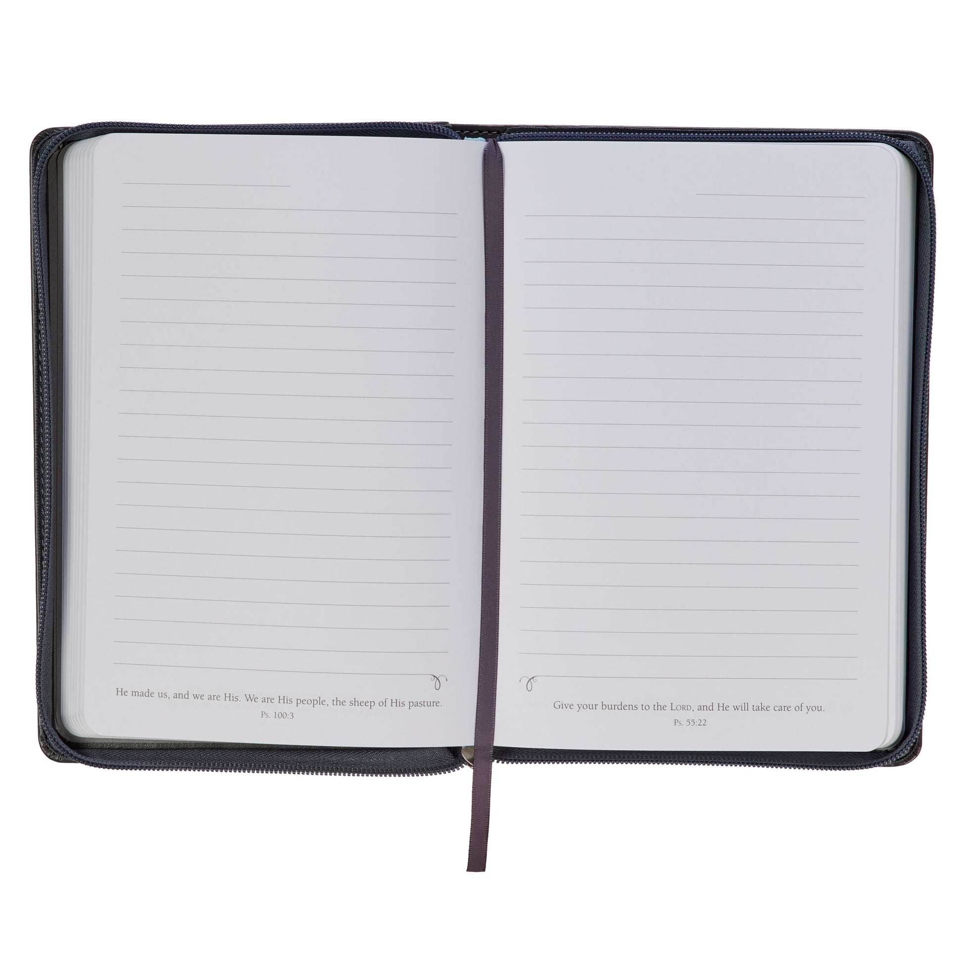 This classic journal offers 336 lined pages, each of which is imprinted with a thoughtful Scripture verse at the bottom. A handy black ribbon marker is included for effortless bookmarking.