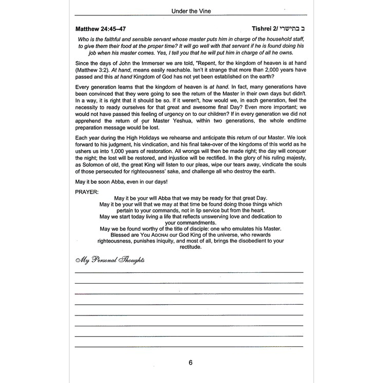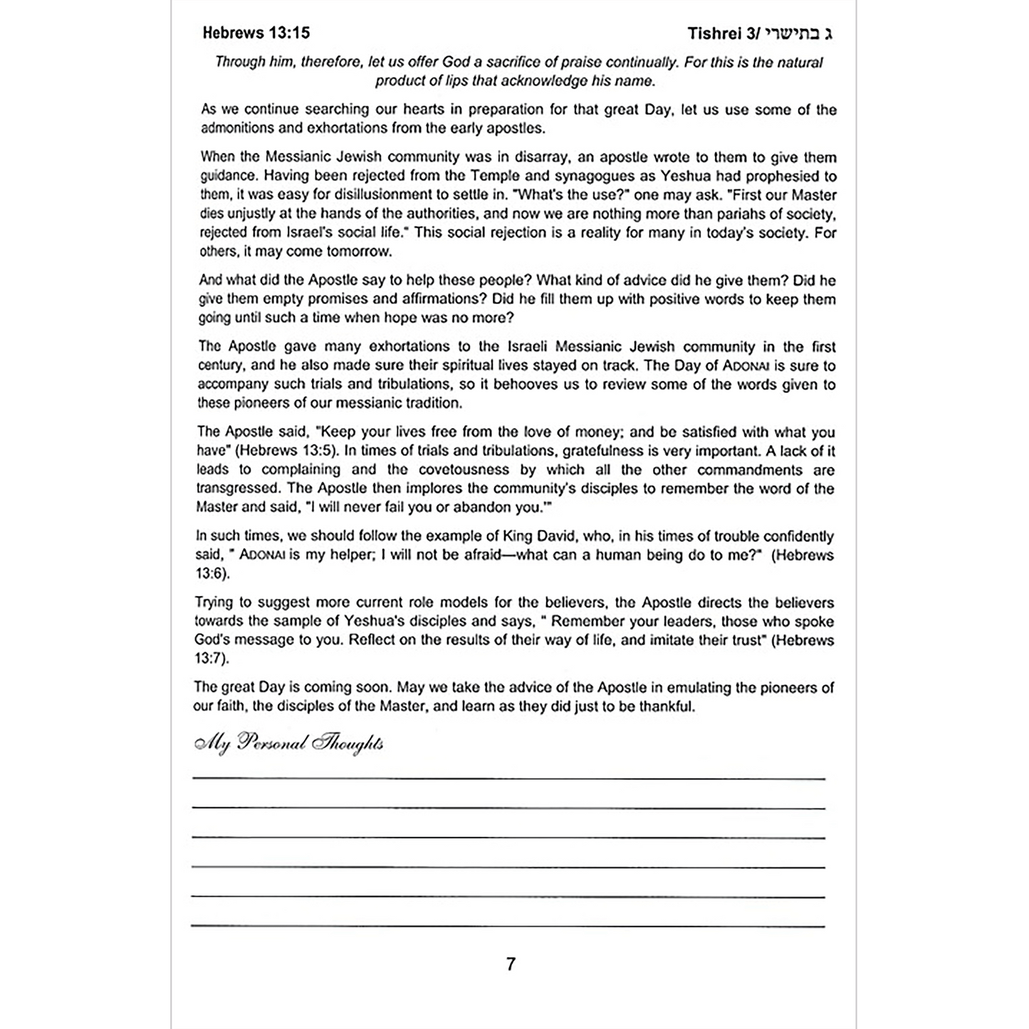 Journey daily through the Hebrew Calendar and Biblical Feasts into the B'rit Hadashah (New Testament) Scriptures as they are put in their rightful context, bringing Judaism alive in its full beauty. Messianic faith was the motor and what gave substance to Abraham's new beliefs, hope to Job, trust to Isaac, vision to Jacob, resilience to Joseph, courage to David, wisdom to Solomon, knowledge to Daniel, and divine Messianic authority to Yeshua.