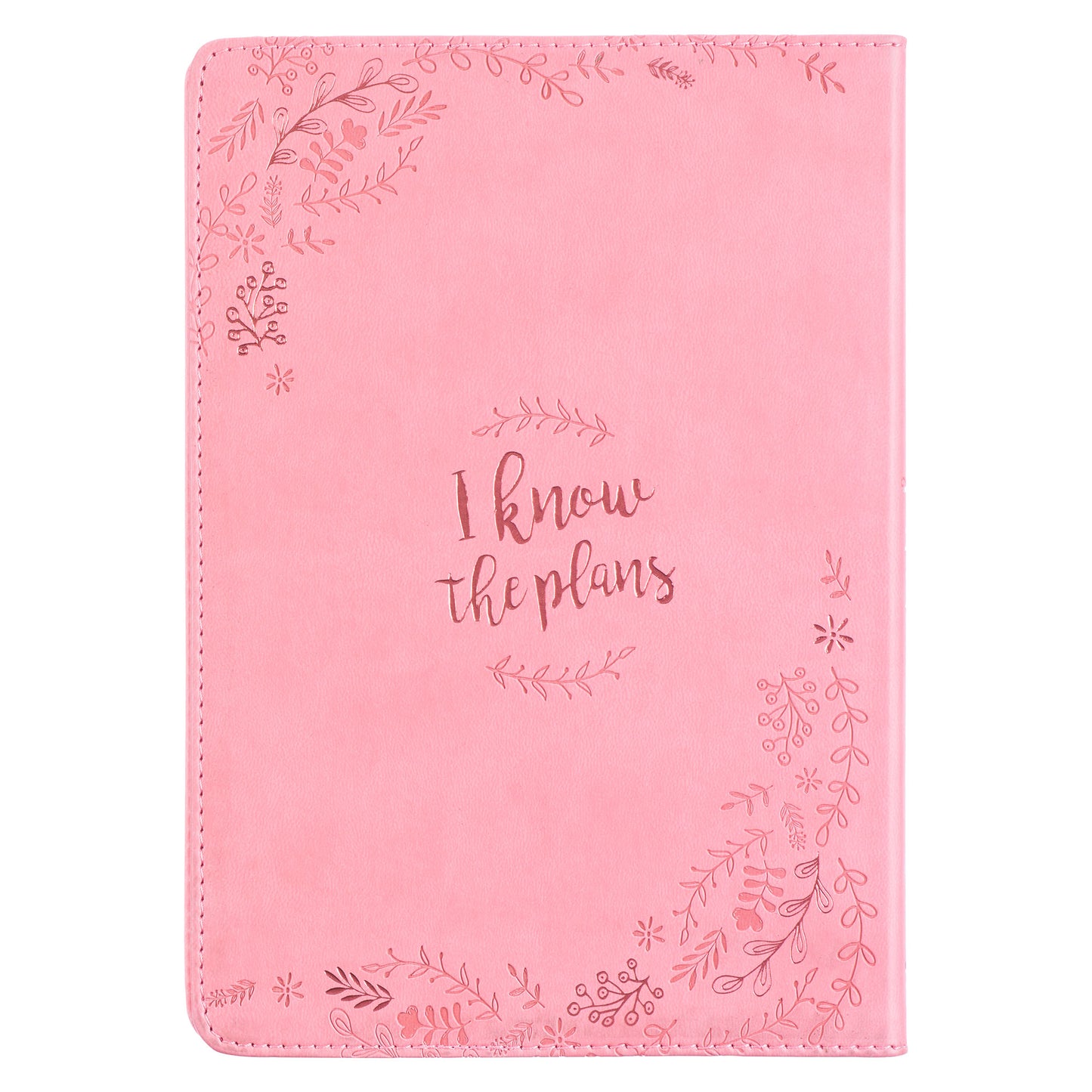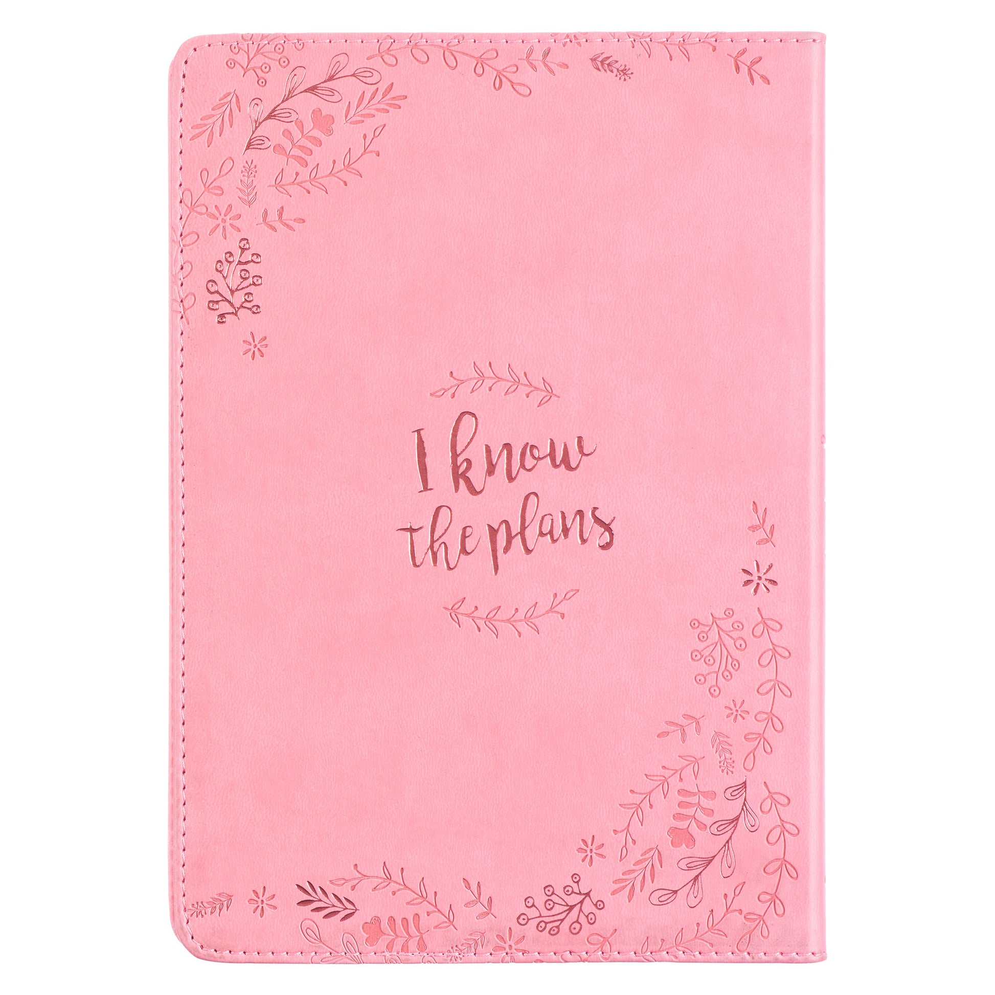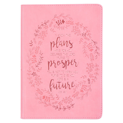 The smooth pink faux leather cover is debossed with a floral leaf wreath encircling the complete Scripture verse from Jeremiah 29:11.
