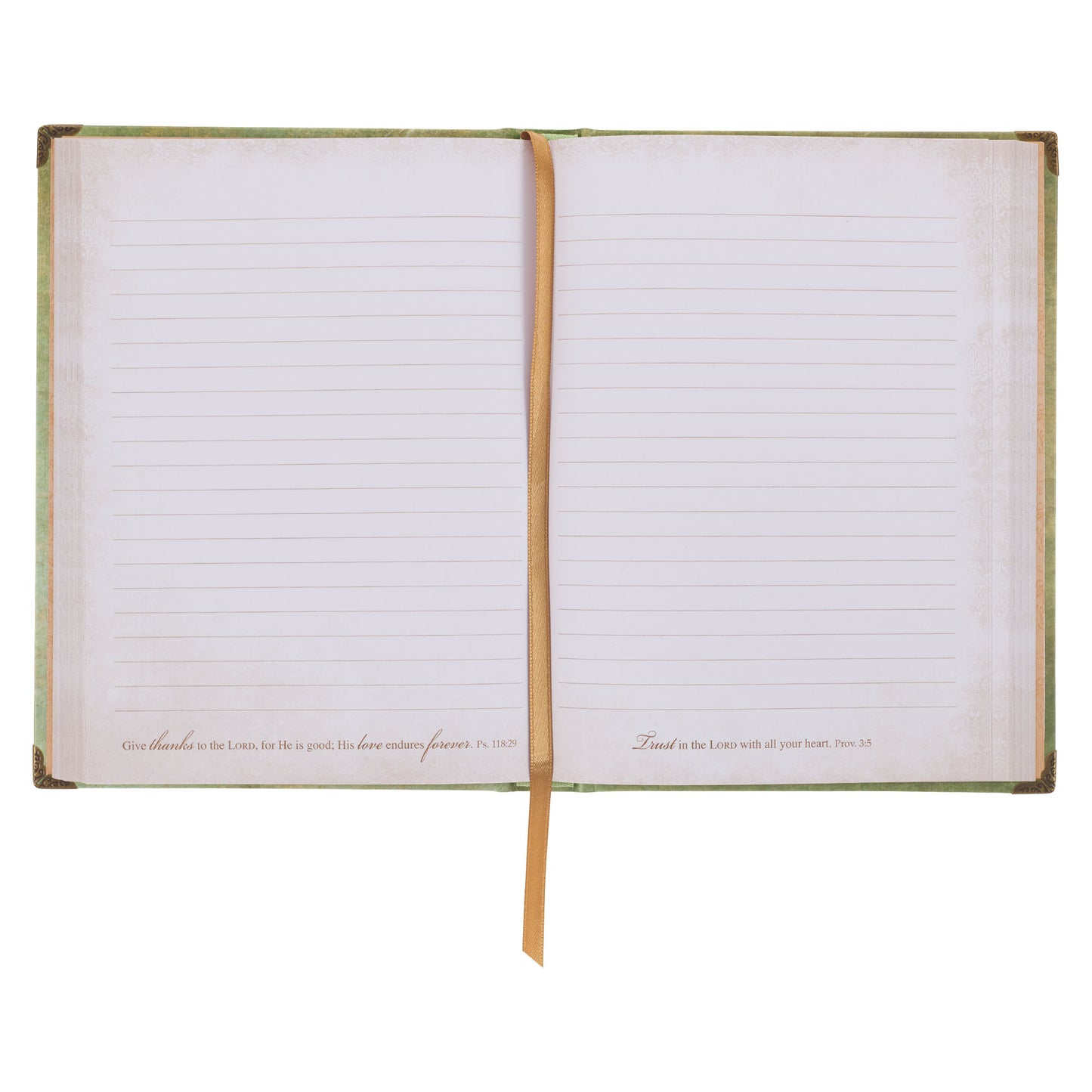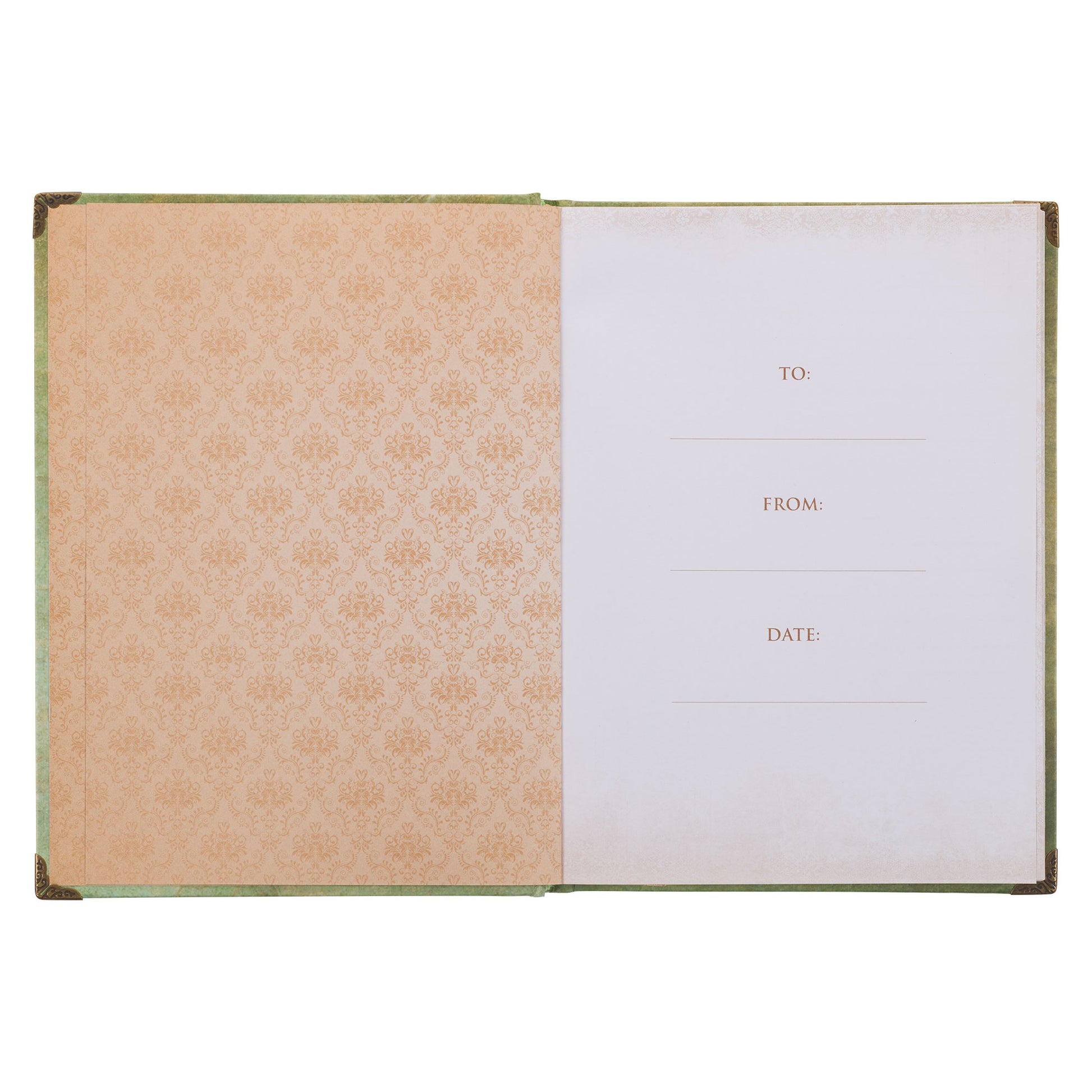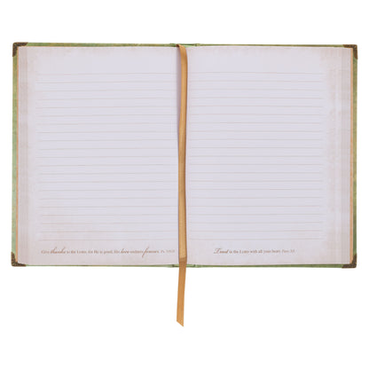 To elevate its design, the Faith Bee Hardcover Journal incorporates exquisite details such as elegant metallic corners. These additions infuse the journal with a touch of sophistication and enhance its visual appeal, making it a true delight to behold. As you turn to the back cover, you'll be greeted by the same mottled green background, adorned with the whole verse beautifully presented in gold-foiled letters.