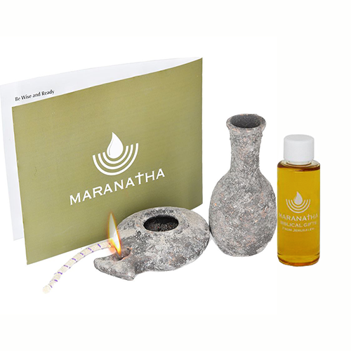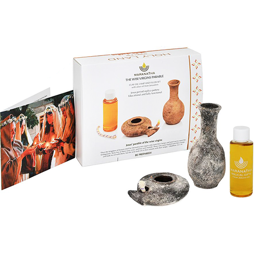 This inspiring clay lamp set comes with a pamphlet describing Jesus' parable of the wise virgins.  This is the type of oil lamp and filler that would have been used by Jesus and His disciples in Jerusalem.