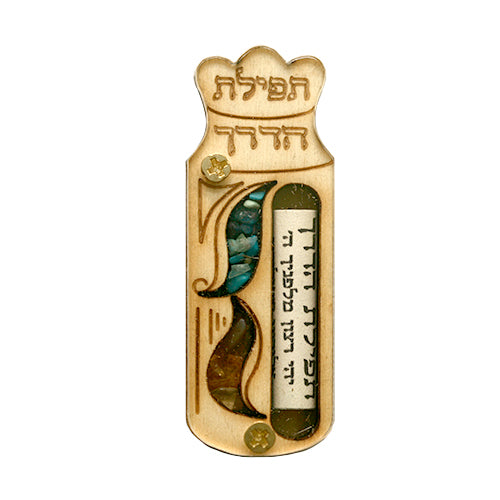 Handmade in Israel, this mezuzah is constructed using wood and plexiglass. The top bears the Hebrew inscription תפילת הדרך "Tefilat HaDerech," meaning "Journey Prayer."